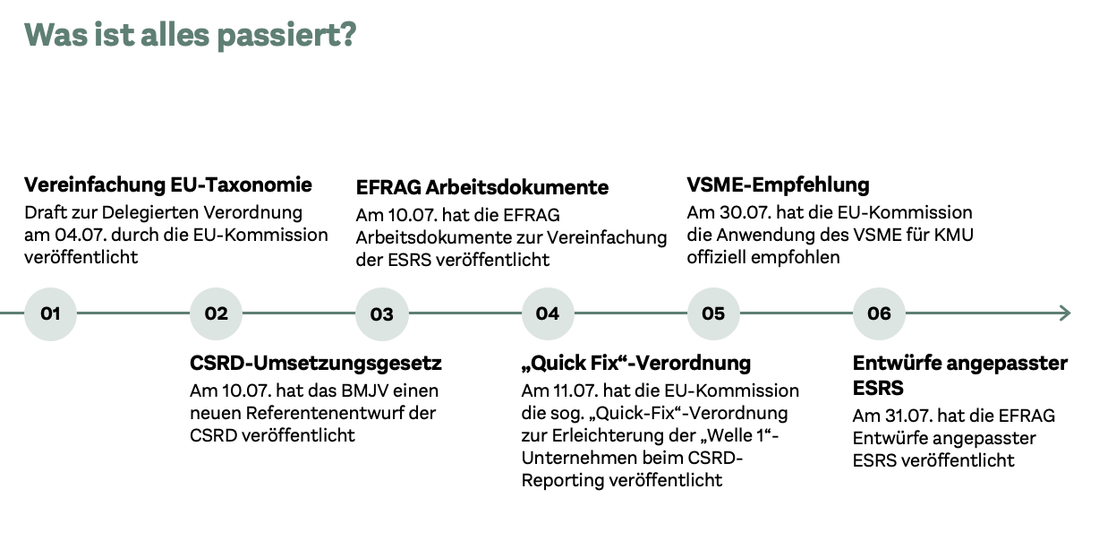 Die EU-Kommission hat am 11. Juli 2025 die sogenannte „Quick Fix“-Verordnung veröffentlicht. Diese nimmt Änderungen an den aktuellen ESRS vor. Dadurch werden bestimmte Berichtsanforderungen für CSRD-berichtspflichtige Unternehmen der Welle 1 verschoben. Der Rechtsakt befindet sich aktuell in der „Scrutiny Period“: EU-Parlament und Rat können innerhalb von vier Monaten Einspruch erheben. Geschieht dies nicht, tritt die Verordnung voraussichtlich im November 2025 in Kraft. Eine Umsetzung in nationales Recht ist dabei nicht notwendig.