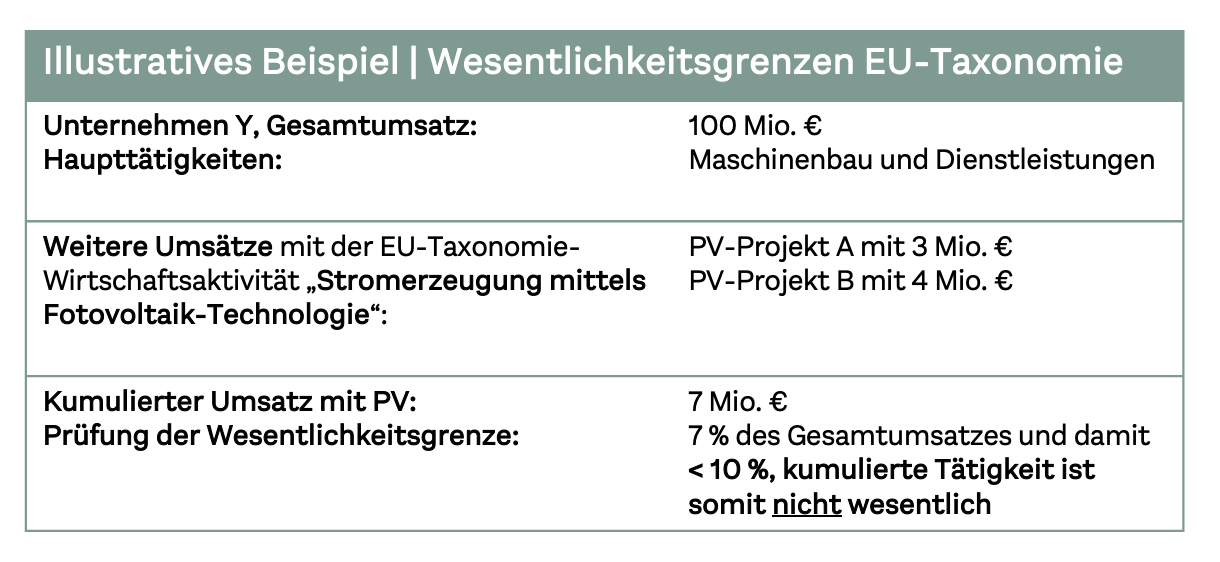 Der neue Rechtsrahmen soll Wesentlichkeitsgrenzen vorsehen: Unternehmen müssen unwesentliche Wirtschaftsaktivitäten künftig nicht bei der EU-Taxonomie-Prüfung berücksichtigen. In der Praxis haben einige Unternehmen bereits mit Wesentlichkeitsgrenzen gearbeitet – darunter auch Kunden von uns. In Abstimmung mit den jeweiligen Wirtschaftsprüfern haben wir Grenzen definiert, um die Anforderungen pragmatisch umzusetzen.